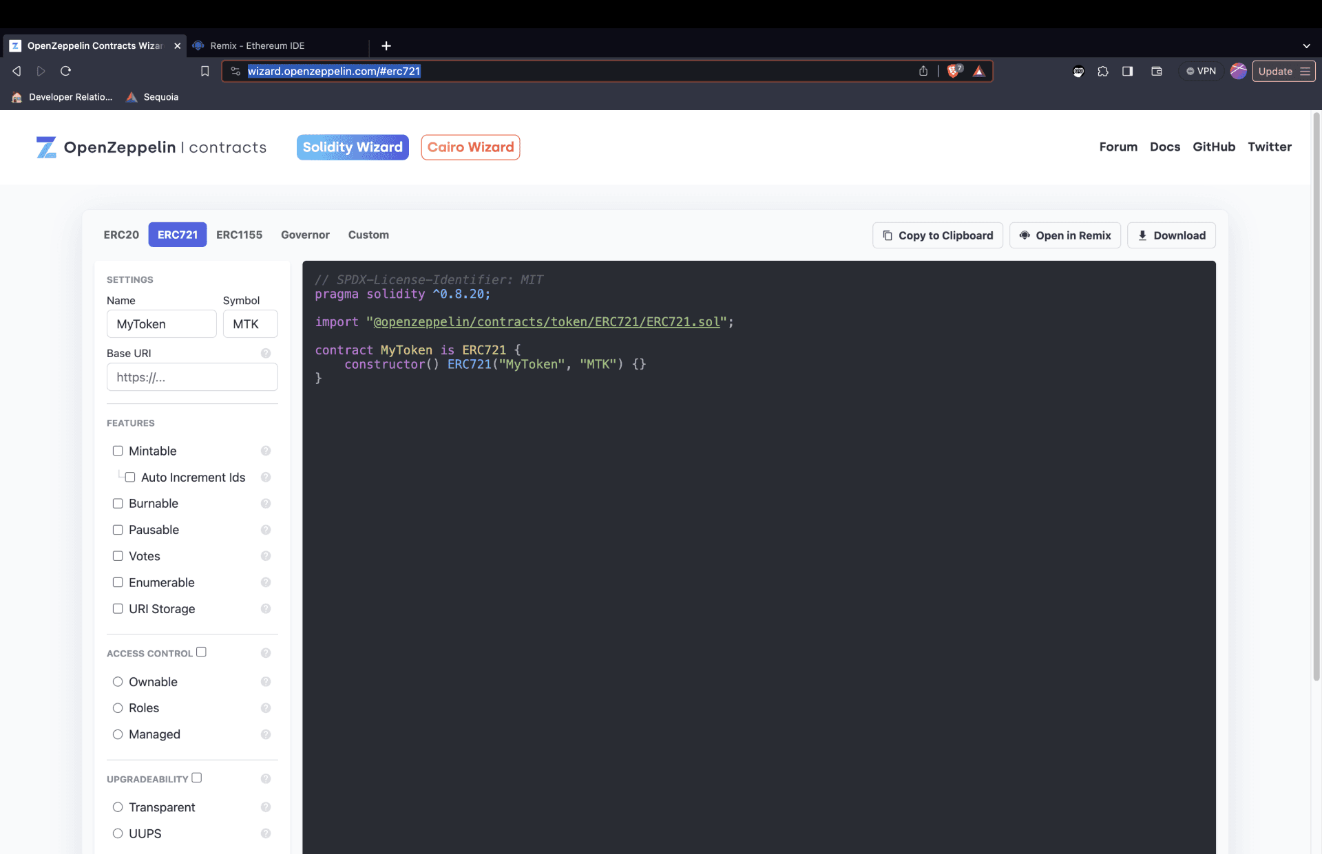 To start, head over to wizard.openzeppelin.com/#erc721 where you should see the following: